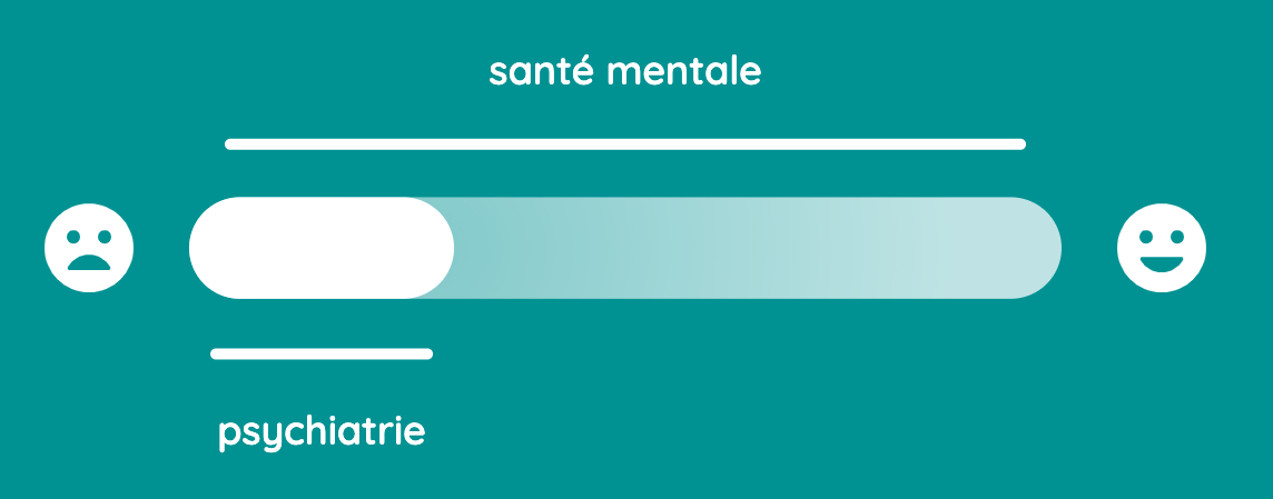 Par ailleurs, ce terme recouvre autant une "bonne" santé mentale que la maladie psychique. C'est en cela que l'idée de santé mentale se distingue de celle de psychiatrie – bien que ces deux notions aient tendance à être confondues. Le terme de psychiatrie renvoie au seul aspect pathologique – ou problématique – d'une réalité bien plus large, qu'est la santé mentale.
